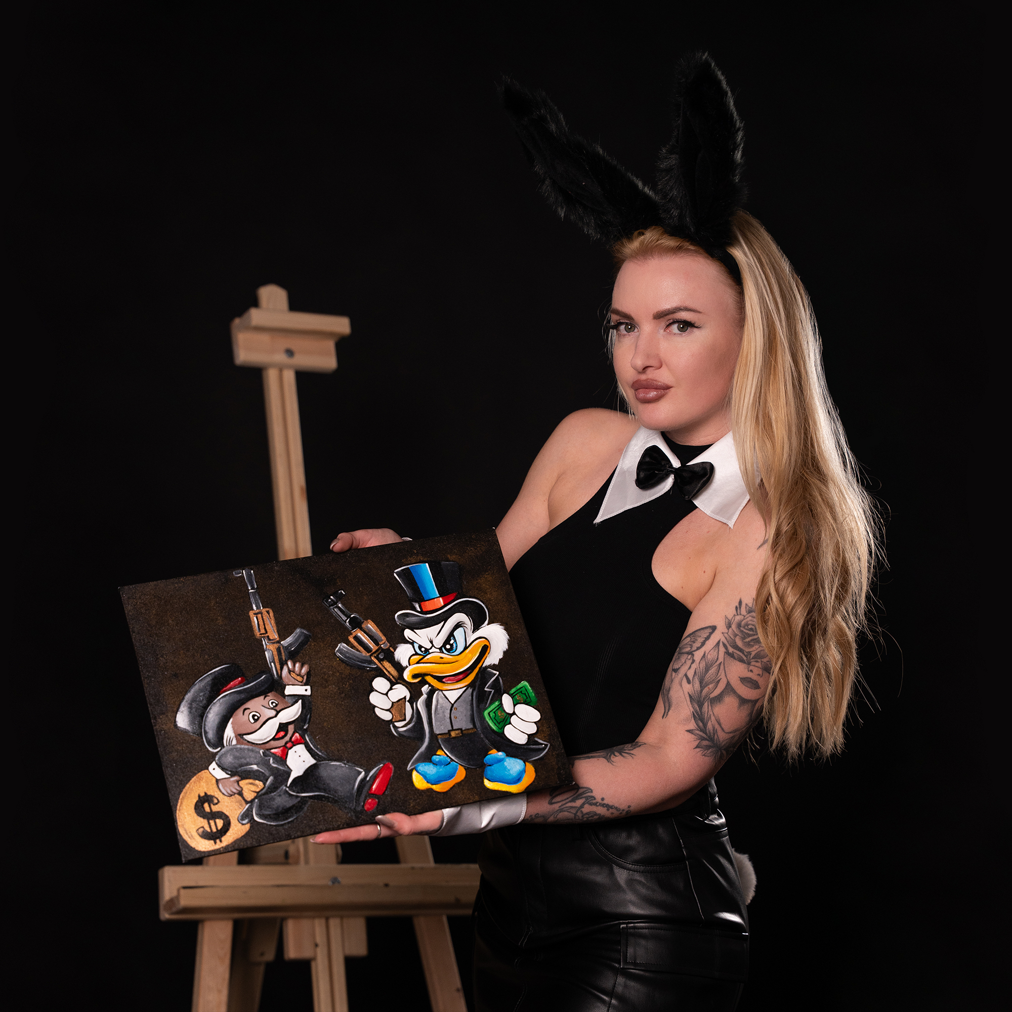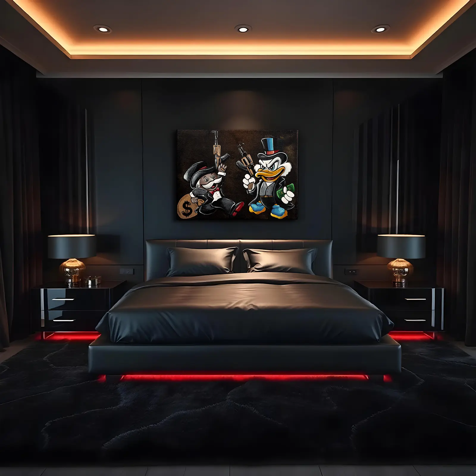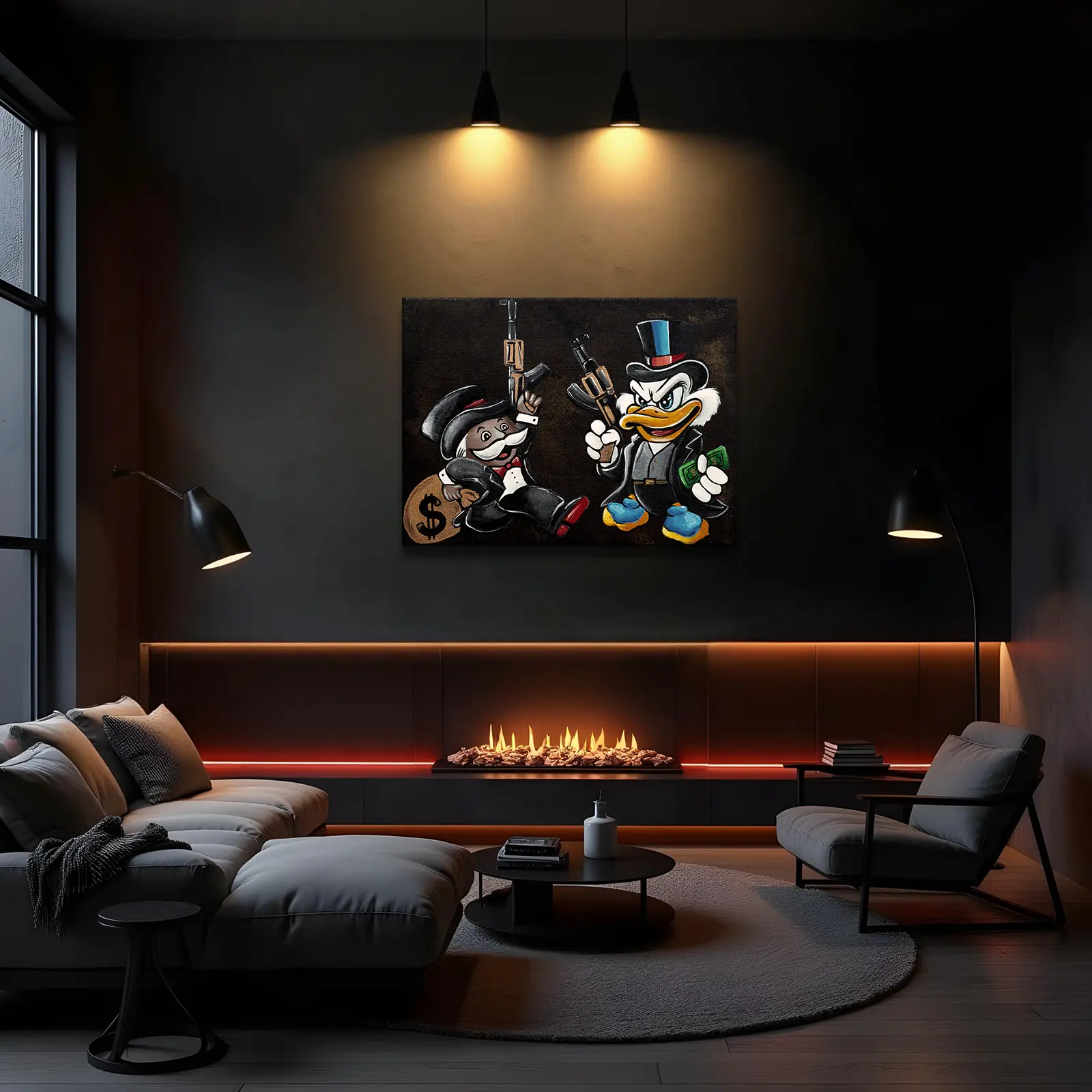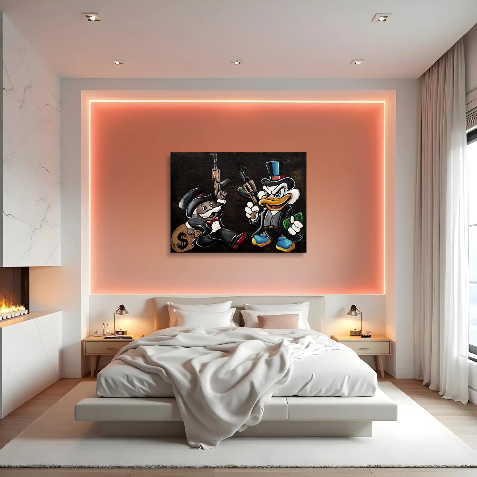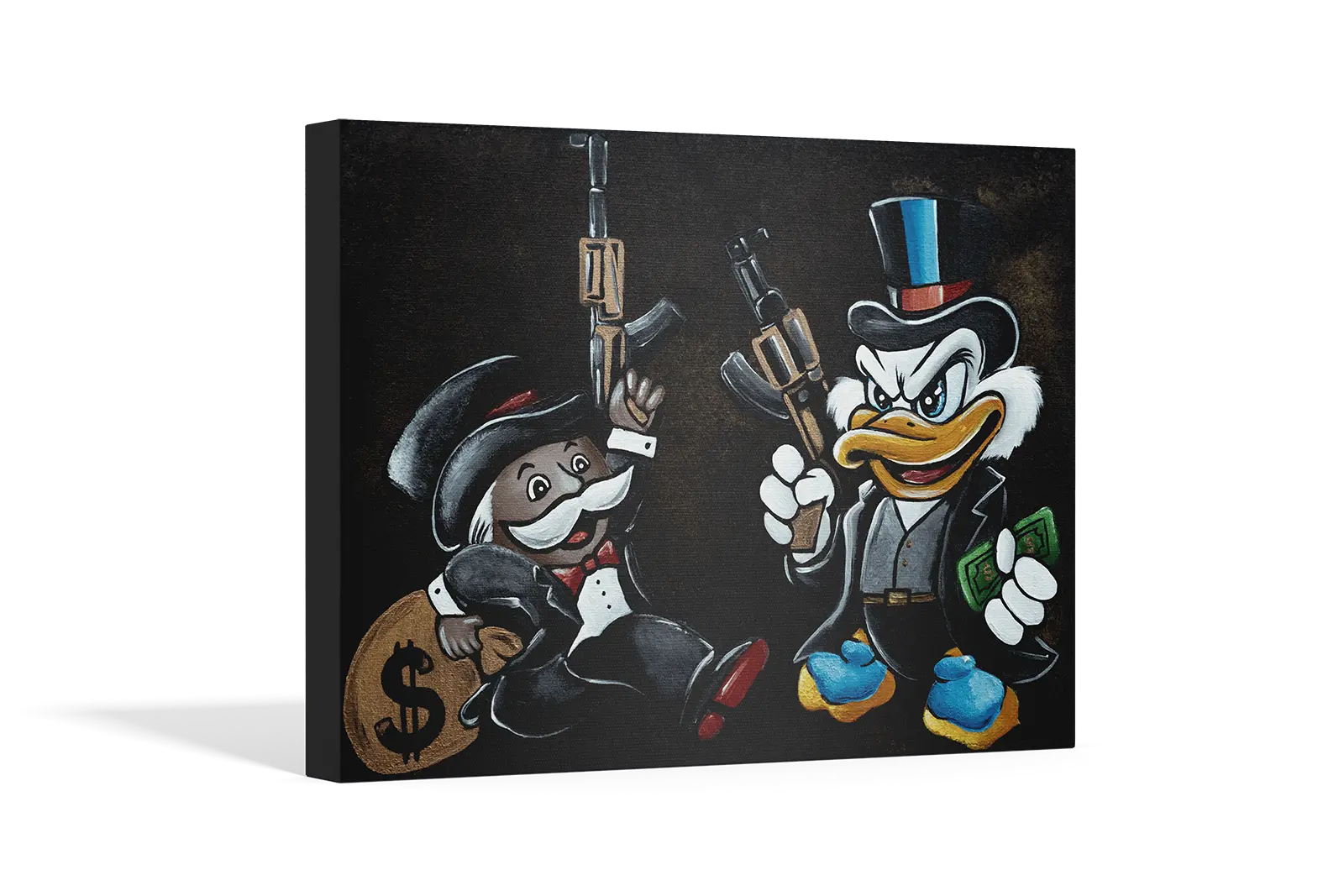In Hostile Takeover, money, power, and violence intertwine in a ruthless display of dominance. Scrooge McDuck and Monopoly’s Rich Uncle Pennybags, dressed in sharp suits, wield AK-47s, no longer just businessmen, but kingpins of an empire built on ambition and control.
