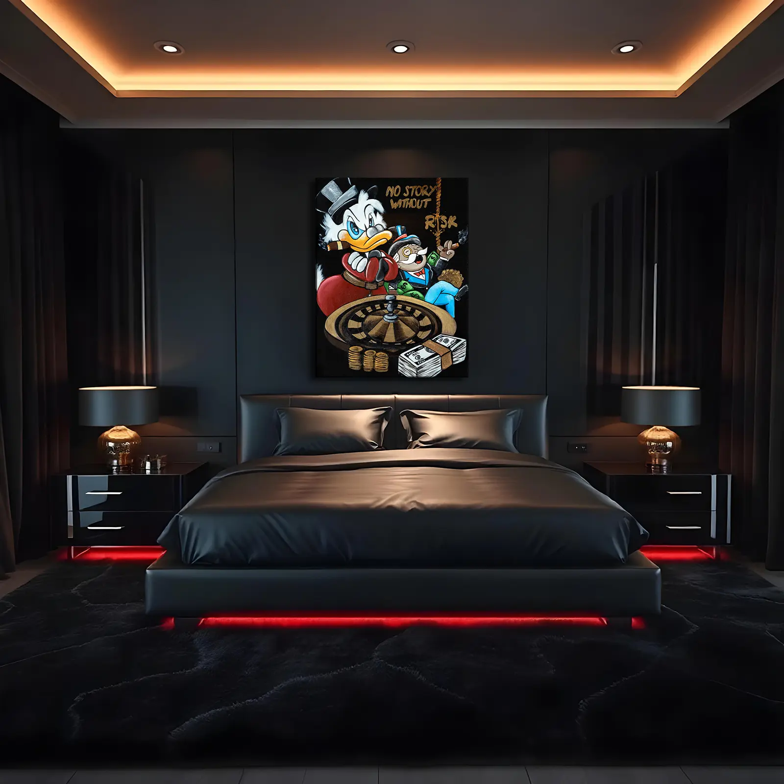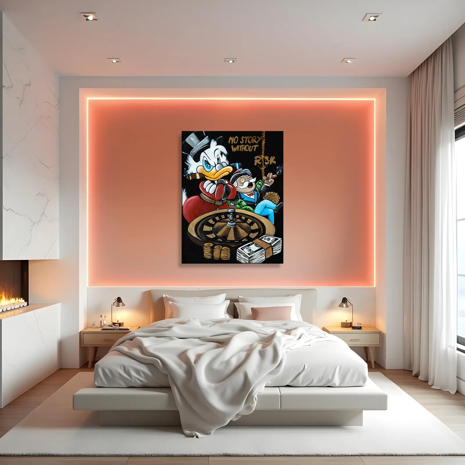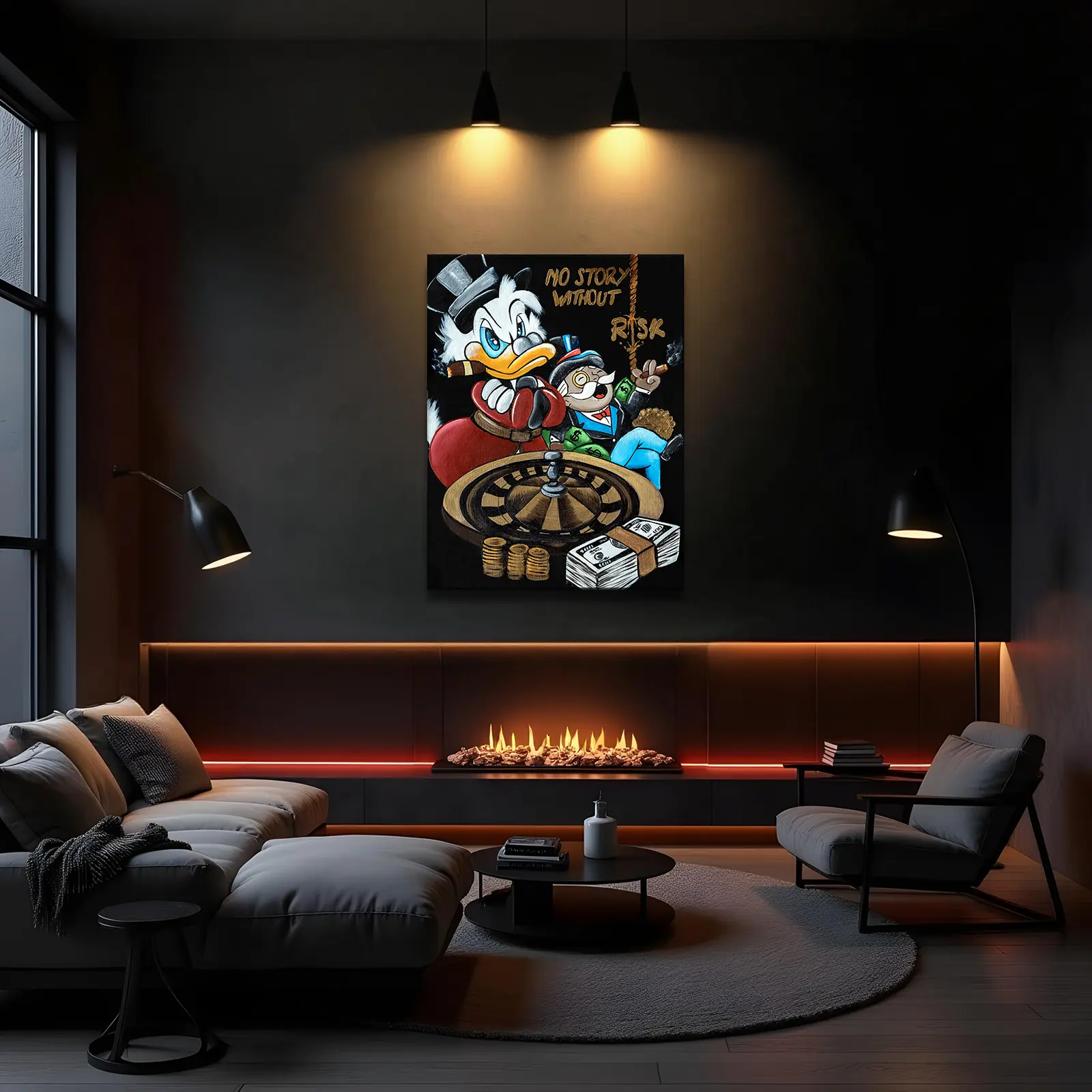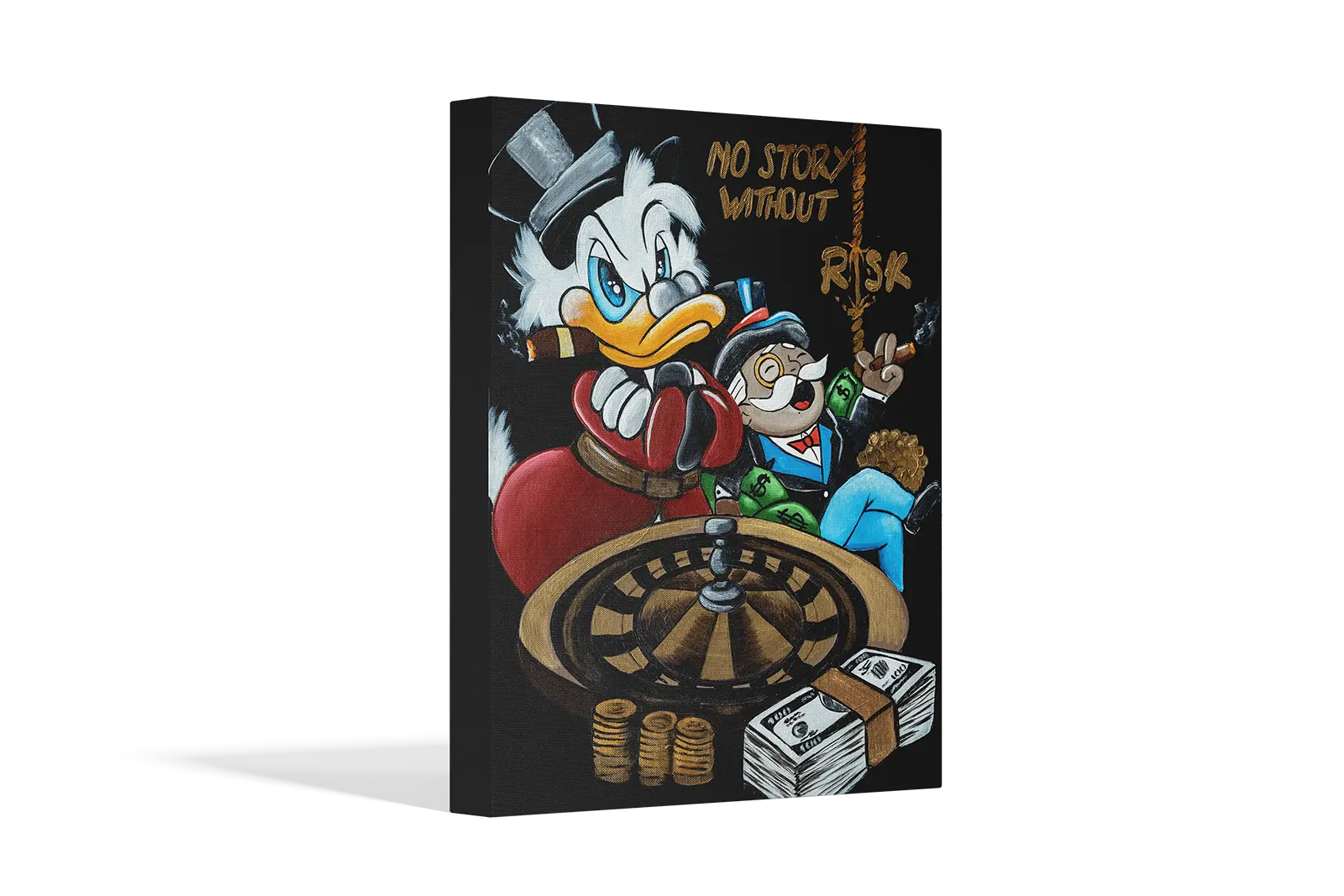 In No Story Without Risk, wealth, power, and high-stakes gambling collide in a bold depiction of ambition. Scrooge McDuck, cigar in beak and boxing gloves on, embodies the self-made tycoon, while Monopoly’s Rich Uncle Pennybags lounges in luxury, surrounded by cash and gold.