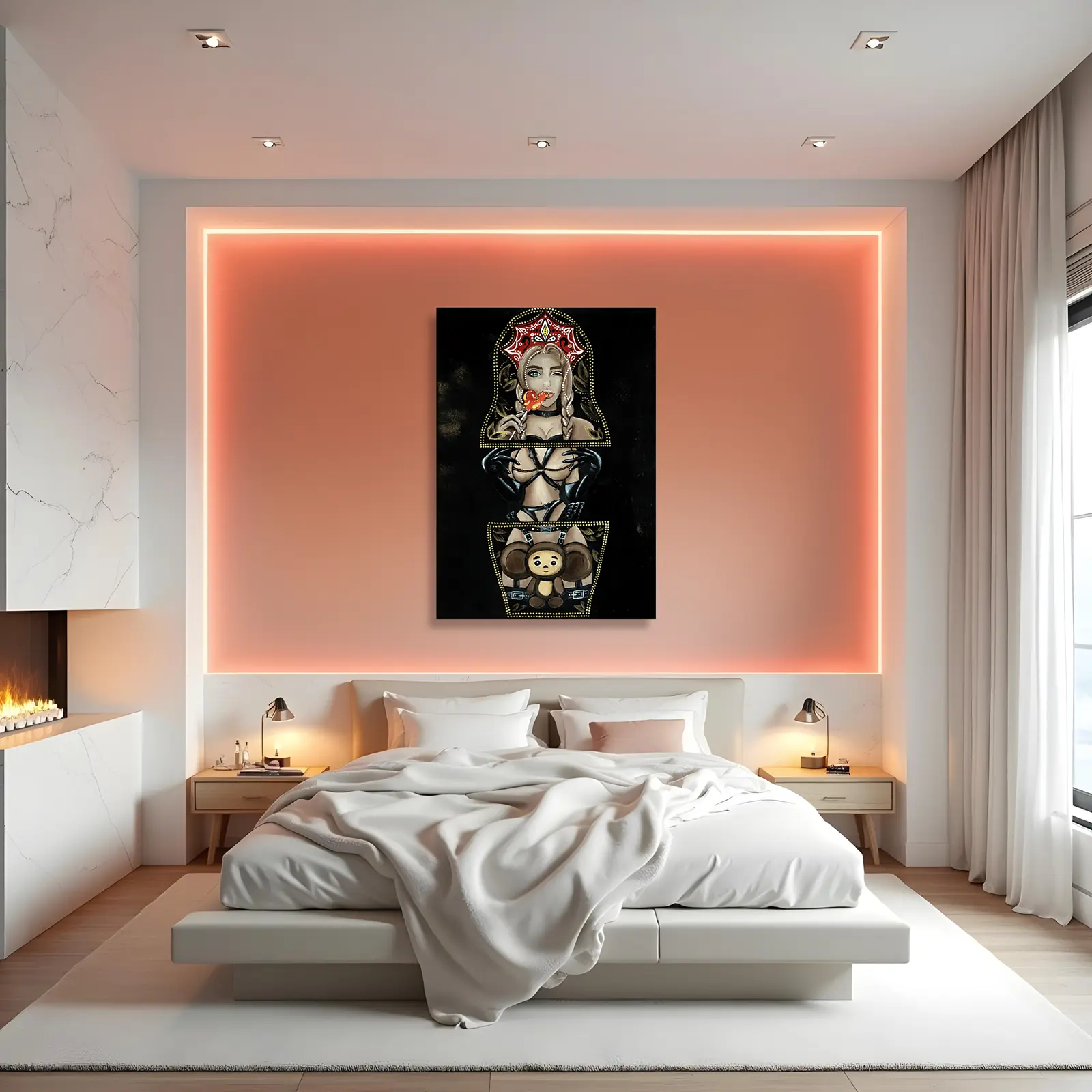 In Temptation Matryoshka, innocence and seduction intertwine in a daring reimagining of the classic Russian nesting doll. The winking femme fatale, adorned with a kokoshnik, bites into a heart-shaped lollipop, a symbol of fleeting sweetness laced with temptation. Wrapped in black latex gloves, leather straps, and bondage elements, she subverts tradition, turning the matryoshka into an icon of empowerment and sensual rebellion.