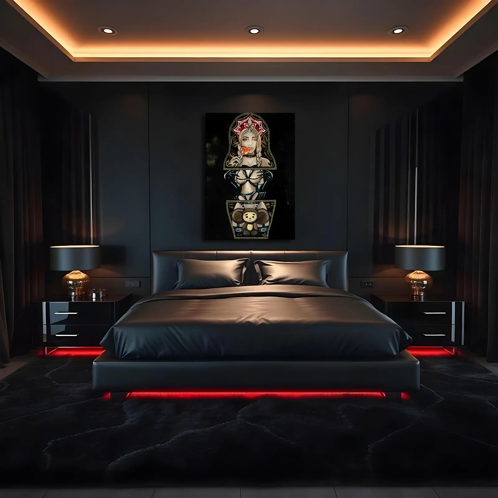 Beneath the surface, the beloved Cheburashka sits restrained, caught between nostalgia and provocation. Gold embellishments glow against the dark backdrop, emphasizing the contrast between heritage and desire, restraint and indulgence. This piece invites the viewer to peel back the layers, what lies beneath the surface of pleasure and power?